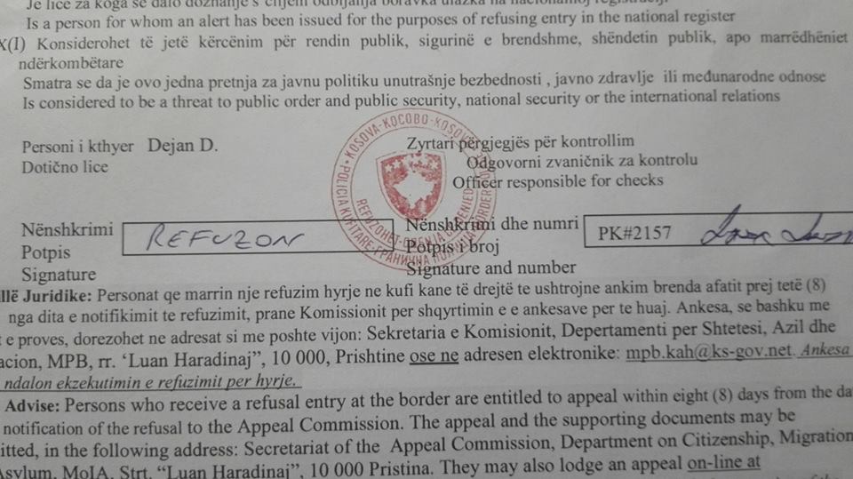 Забрана уласка на Косово и Метохију, 23. новембар 2018.